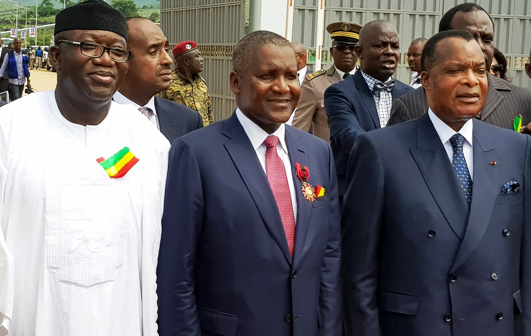 L-R: Representative of President Mohammadu Buhari, the Minister of Mines and Steel Development, Dr. Kayode Fayemi; President/CE, Dangote Group, Aliko Dangote; President of the Republic of Congo, Denis Sassou Nguesso, at the commissioning of 1.5MMTPA Dangote Cement Plant, Congo, held in the Republic of Congo on Thursday November 23, 2017 (Source: Dangote Group | 8 years ago) |