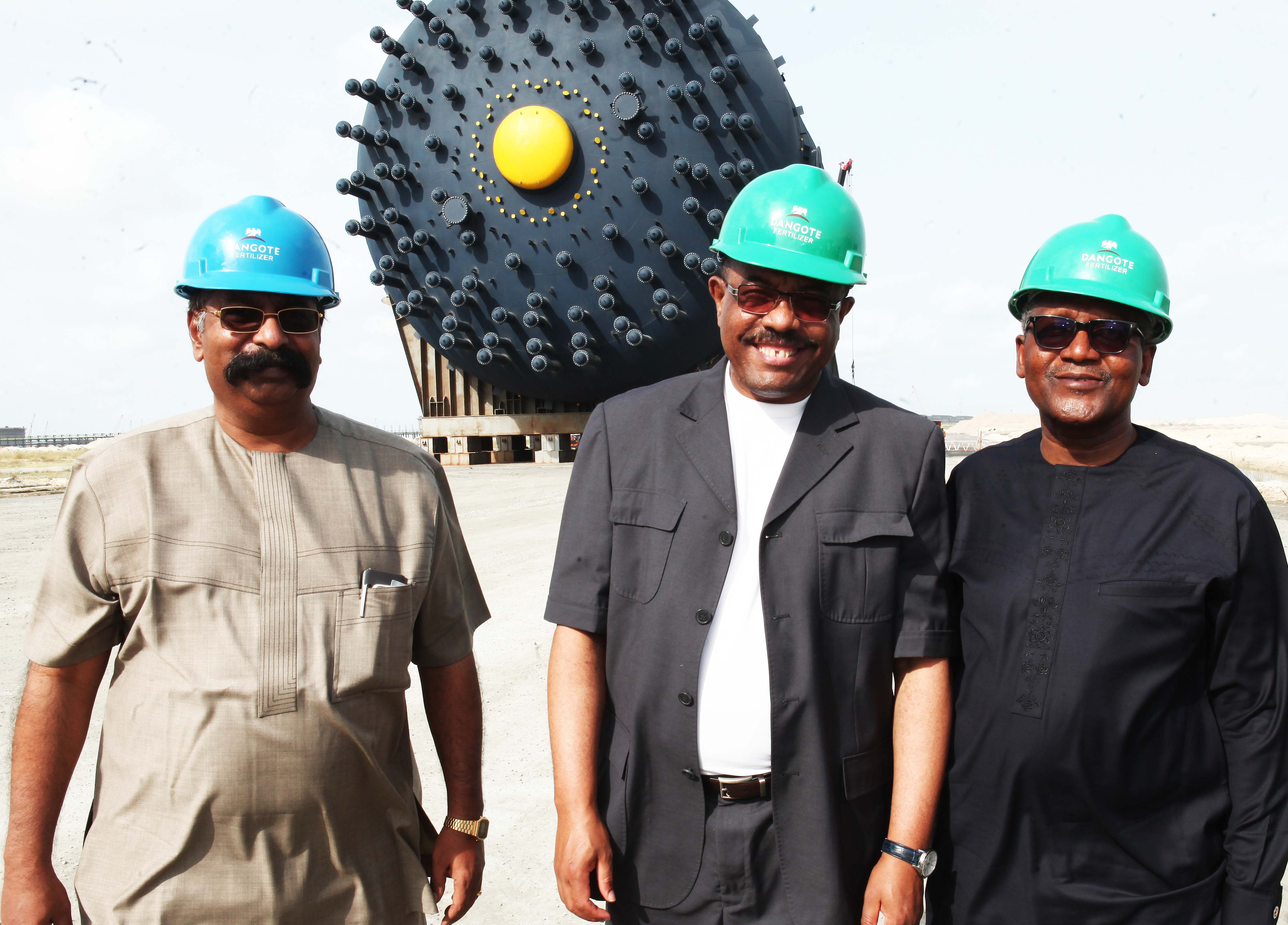 L-R: Group Executive Director, Strategy, Capital Projects & Portfolio Development, Dangote Industries Limited, Devakumar Edwin; Former Prime Minister of Ethiopia, Hailemariam Desalegn; and President/CE, Dangote Industries Limited, Aliko Dangote; during the Former Prime Minister’s visit to the Dangote Refinery and Fertilizer Projects in Lekki, Lagos on Friday, April 26, 2019 (Source: Dangote Group | 6 years ago) |