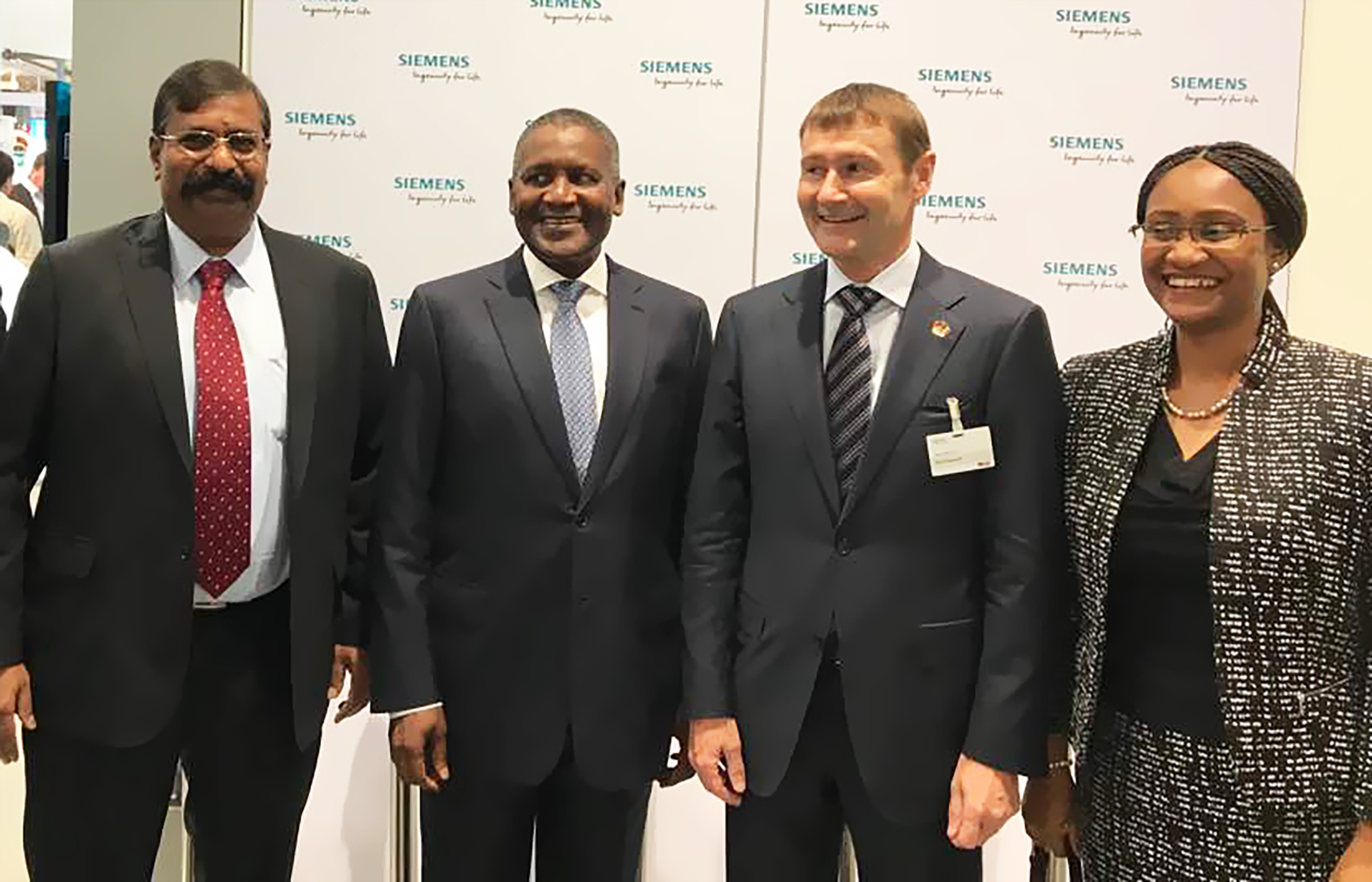 President/Chief Executive, Dangote Industries Limited, Aliko Dangote, (second left);Group Executive Director, Strategy, Portfolio Development and Capital Projects, Dangote Industries Limited, Devakumar V. G. Edwin (Left); Member of the Managing Board of Siemens AG, Klaus Helmrich (Second right); and Managing Director/CEO, Siemens Nigeria, Mrs. Onyeche Tifase (right), yesterday at the Hannover Fair, Germany, the world's leading Trade Fair for Industrial Technology